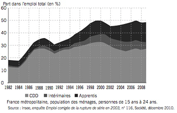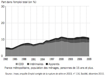 AccueilExpressions par MontaigneLes jeunes et les peu diplĂ´mĂ©s, premières victimes des contrats courtsLa plateforme de dĂ©bats et d’actualitĂ©s de l’Institut Montaigne RĂ©gulation Éducation07/12/2011ImprimerPARTAGERLes jeunes et les peu diplĂ´mĂ©s, premières victimes des contrats courtsAuteur Institut Montaigne La part des "formes particulières de l’emploi" (CDD et contrats saisonniers, intérim, stages et contrats aidés, apprentissage) était en 2009 de 50 % parmi les 15-24 ans contre 13 % des actifs sur l’ensemble de la population (1). Hors contrats en alternance, le nombre de jeunes âgés entre 15 et 29 ans employés en CDD et emplois aidés dans le secteur privé ou dans des entreprises publiques s’élève à 25% et à 5% pour les contrats en intérim contre respectivement 10% et 2% pour l’ensemble des actifs (2).DĂ©veloppement des "formes particulières d'emploi" tous âges confondusLa part des "formes particulières d’emploi" (CDD, contrats saisonniers, intĂ©rim, stages et contrats aidĂ©s, apprentissage) a doublĂ© en 15 ans, passant de 1982 Ă 2009 de 5 % Ă 11 % de l'emploi total.DĂ©veloppement des "formes particulières d'emploi" chez les jeunes de 15 Ă 24 ansChez les jeunes, la part des "formes particulières d'emploi" a augmentĂ© tout au long des annĂ©es 1980 et 1990 avant de se gĂ©nĂ©raliser puisqu'elles reprĂ©sentent, en 2009, près de la moitiĂ© des emplois, contre près d'un sur cinq en 1982.Dans son Ă©tude Un CDI pour tous , l’Institut Montaigne propose de supprimer le CDD et de gĂ©nĂ©raliser le CDI en envisageant très prĂ©cisĂ©ment les modalitĂ©s juridiques d’une telle dĂ©cision.- Pourquoi proposer un CDI pour tous ? Qu’y gagnent les employeurs ? Qu’y gagnent les employĂ©(e)s ? Les rĂ©ponses de CĂ©line Gleize, auteur de l’Ă©tude Un CDI pour tous. - 15 propositions pour l’emploi des jeunes et des seniors, Rapport, septembre 2010(1) Insee, MarchĂ© du travail, sĂ©ries longues, n° 116, dĂ©cembre 2010. (2) DARES, Emploi et chĂ´mage des 15-29 ans en 2009, octobre 2010, n°072.ImprimerPARTAGER